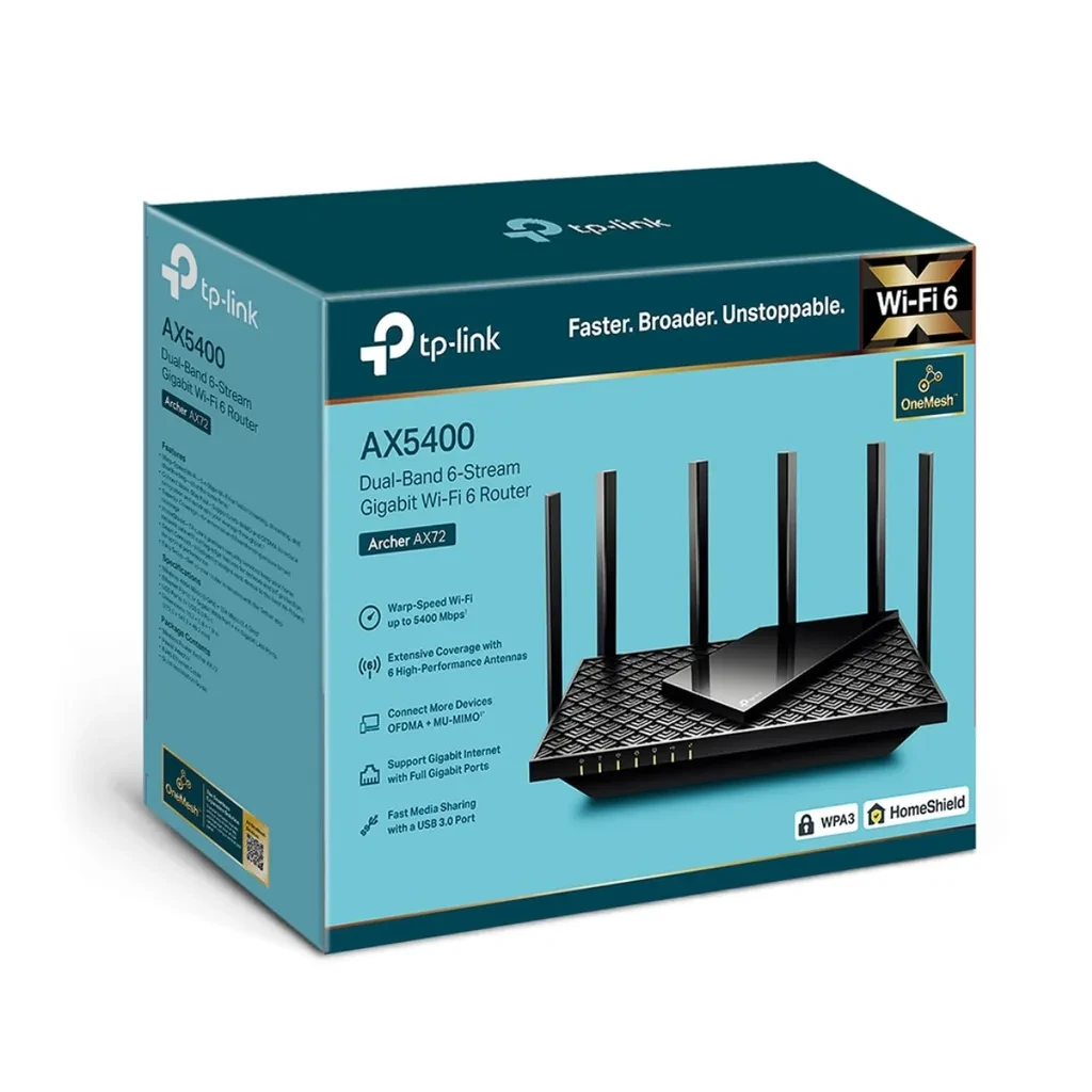 Archer AX72. Router WiFi 6 Tp-Link AX5400 doble banda (4804Mbps en 5GHz y 574Mbps en 2.4GHz) MU-MIMO 4X4 1 puerto WAN 4 puertos LAN 1Gbps